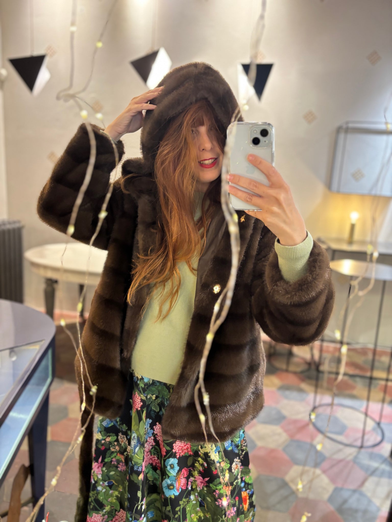 Eco pelliccia con cintura e cappuccio.